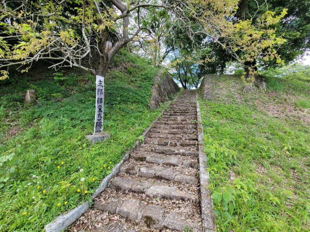 主郭(本丸)は城の中心部で一番大切な所です。全体が見渡せるように一番高い所に築かれています。戦の場合は、城主が指揮をする司令所になります。主郭までは山道や階段を歩いて登って10分程度の場所にあります。