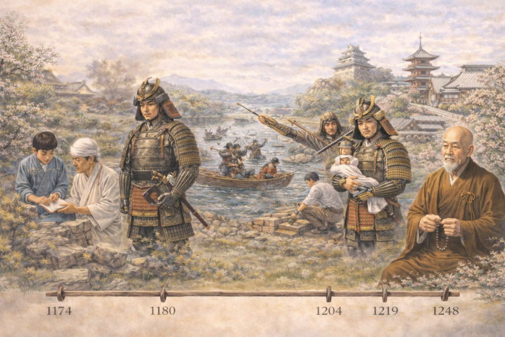 | 1190年 | 建久 1年 | 源頼朝が京都で天皇と会う。 祖父の朝綱は頼朝の供をする。 |